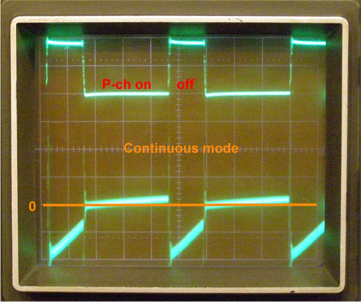 Uppertrack shows the gate(s)-drive, the lower track shows the current through the inductor